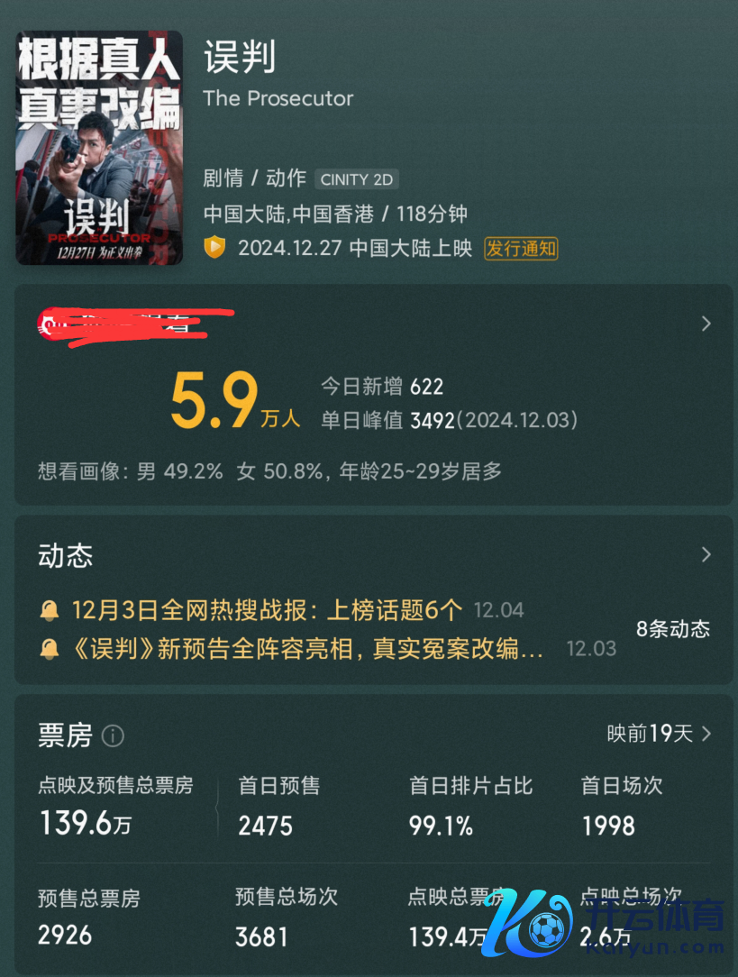 不管哪个方面来看《误判》都有望挽救一下连年来港片的错误,电影在12月6号就开启了预售,况且在12月8号开启了提前点映,要知说念电影精良上映是12月27号,看得出来片方有点急了,原因在于《误判》定档之后热度一直不冷不热。