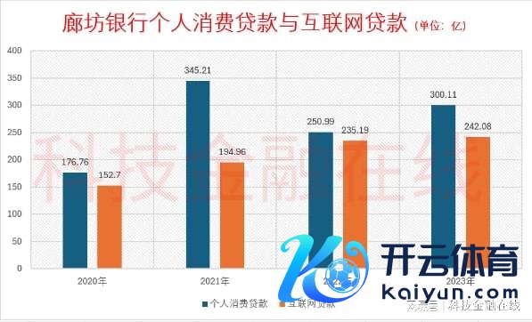 中原幸福暴雷后,廊坊银行也一度把个东说念主糜费贷款当作重心破损标的,先后与蚂蚁金服、微众银行、网商银行、好意思团等驰名平台谐和,借互联网流量发力助贷业务,“助力”住户扩大糜费。2020年到2023年,廊坊银行互联网贷款余额分别为152.7亿、194.96亿、235.19亿、242.08亿,在一说念个东说念主糜费贷款中占比为86.39%、56.48%、93.7%、80.66%。