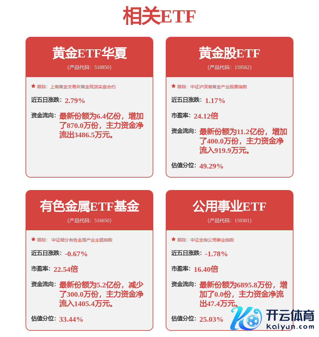 9月24日,金价早盘小幅回调后再度冲高,黄金关系ETF纷纷止跌回升开yun体育网,收尾13:30,有色金属ETF基金(516650)涨0.83%,黄金ETF中原(518850)涨0.49%,黄金股ETF(159562)跌幅收窄至0.29%。